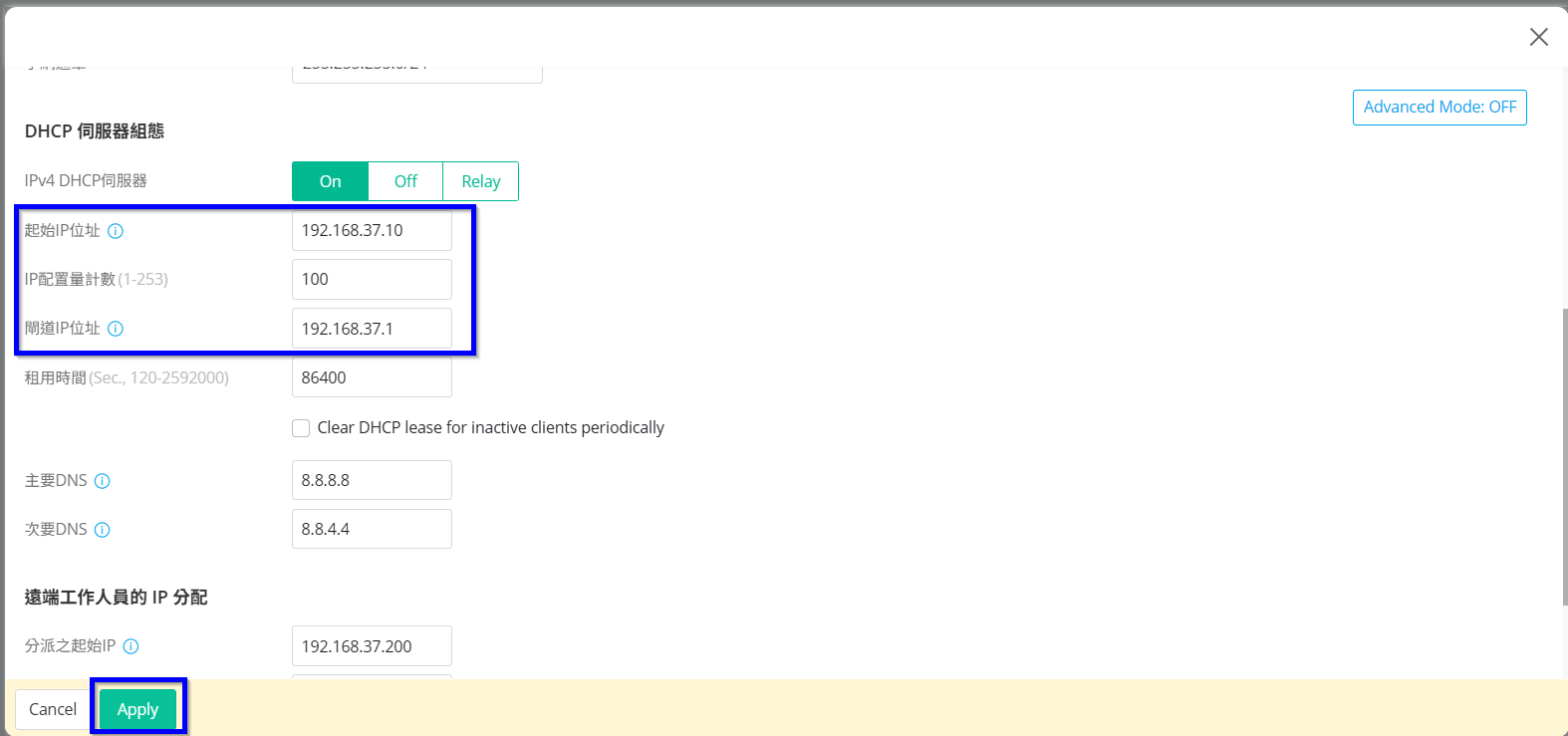 3. DHCP伺服器,指定要配發給訪客網段電腦的IP,起始IP填入192.168.37.10,IP配置量填入100,閘道IP同樣填入LAN IP 192.168.37.1,點選Apply套用設定。