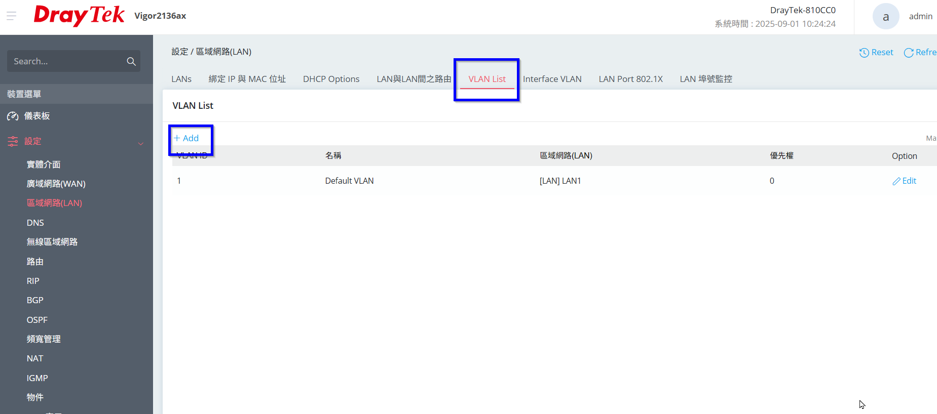 4. 點選[ 設定 > 區域網路 > VLAN List ],點選Add新增設定。