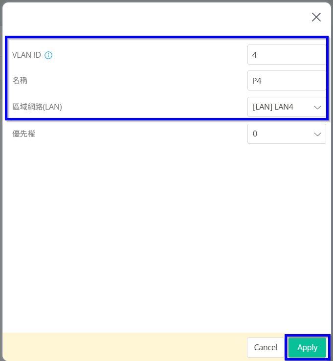 5. VLAN ID填入自定義的獨立ID這邊為4,並填入設定檔名稱,區域網路下拉選擇剛才建立的獨立LAN網段,點選Apply套用設定。