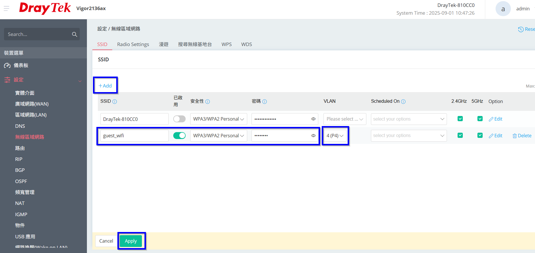 6. 點選[ 設定 > 無線區域網路 > SSID ],點選Add新增設定,依序輸入訪客SSID WIFI名稱,啟用設定檔,WIFI無線連線密碼,VLAN下拉視窗選擇剛才建立的訪客VLAN網段,最後點選Apply即完成設定。