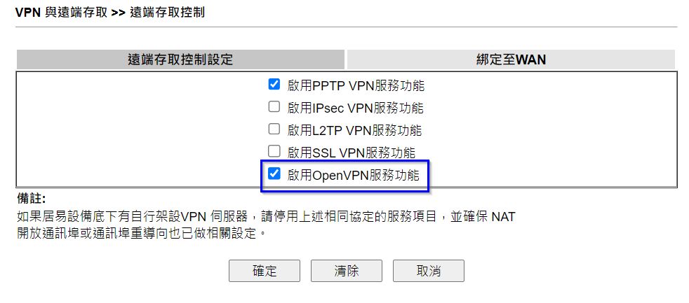 1. 登入Vigor路由器點選[VPN與遠端存取 > 遠端存取控制],檢查OpenVPN服務類型是否有啟用,如果沒有,請勾選啟用後套用設定重開機。