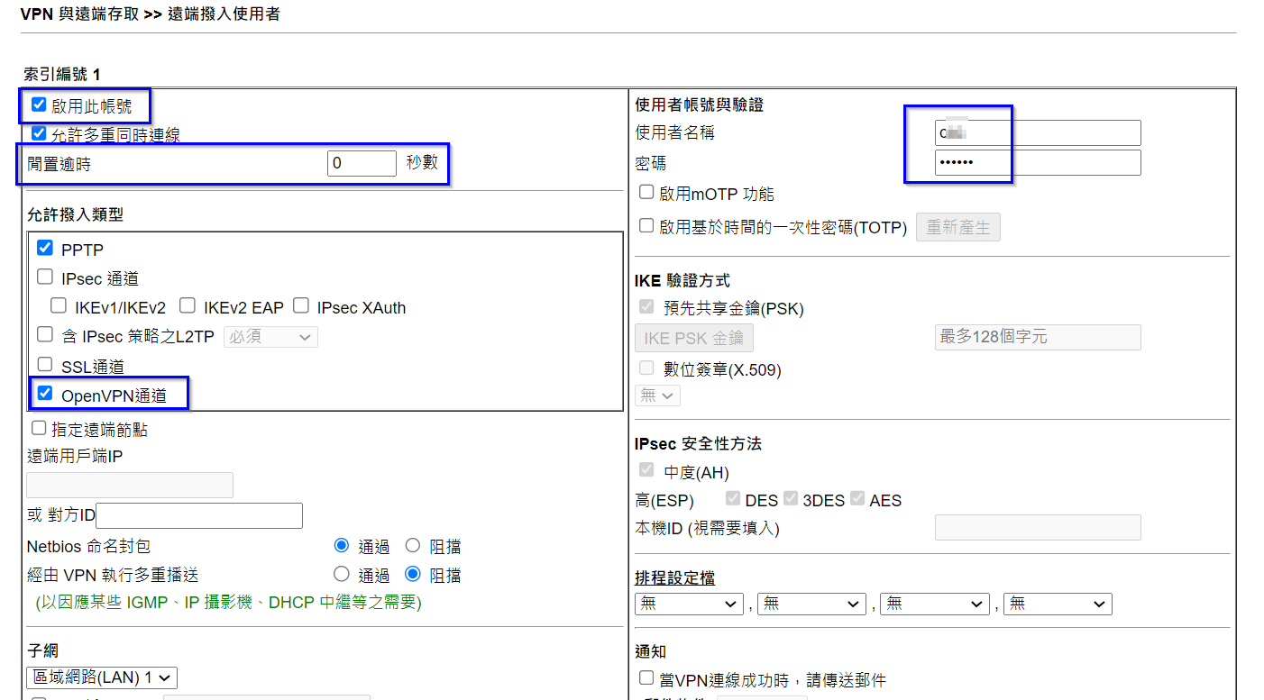 2. 點選[VPN與遠端存取 > 遠端撥入使用者 > 索引編號1],勾選啟用帳號,閒置逾時改0秒,允許撥入類型勾選OpenVPN通道,並輸入所要建立的使用者名稱和密碼。