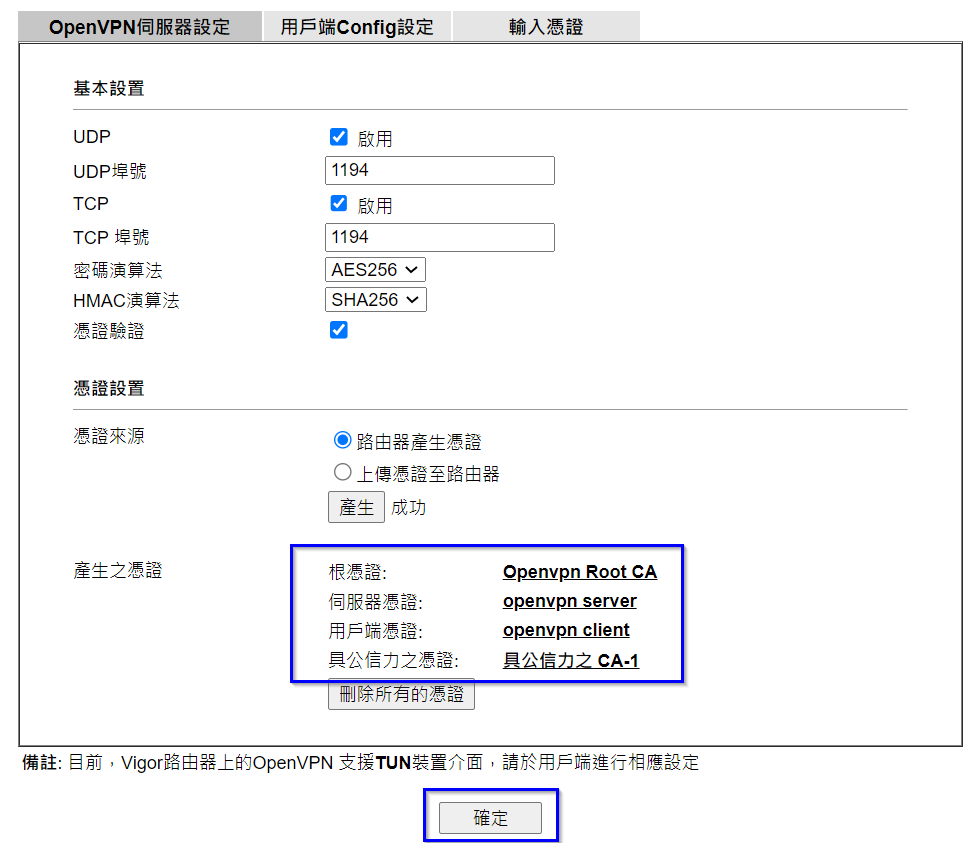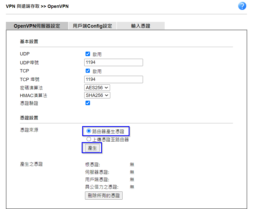3. 點選[VPN與遠端存取 > OpenVPN > OpenVPN伺服器設定],將憑證來源選擇為路由器產生憑證,再點選產生,請稍等一分鐘會自動產生憑證。