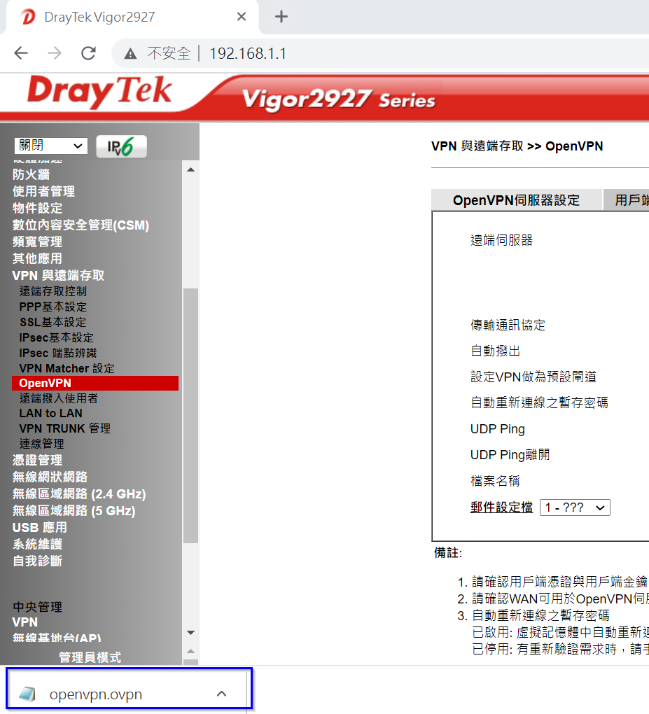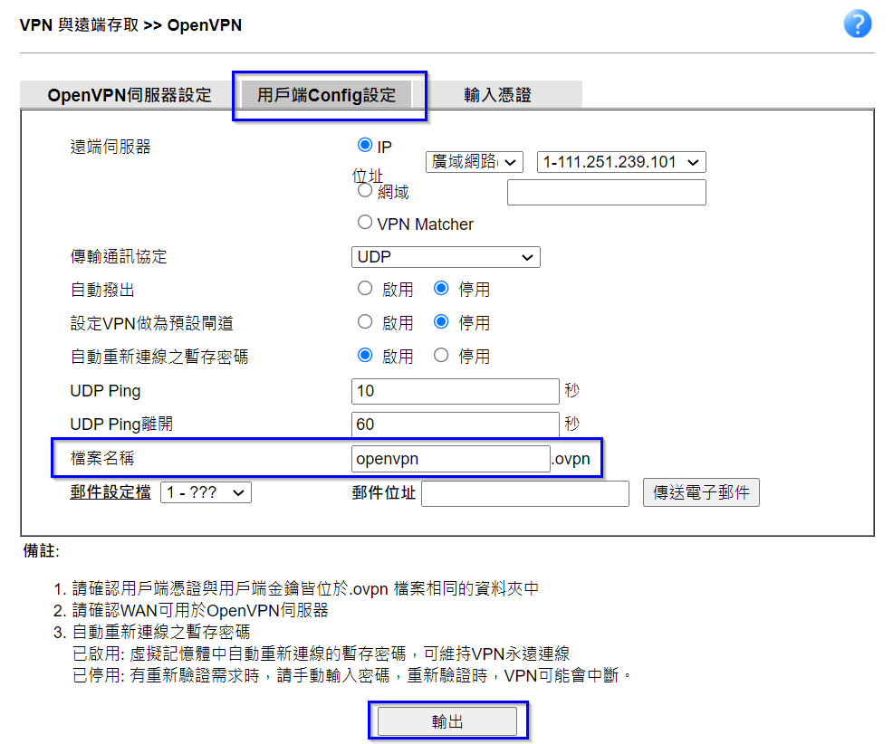 5. 上方分頁切換至用戶端Config設定,輸入所要產生的ovpn檔案名稱,再點選輸出。