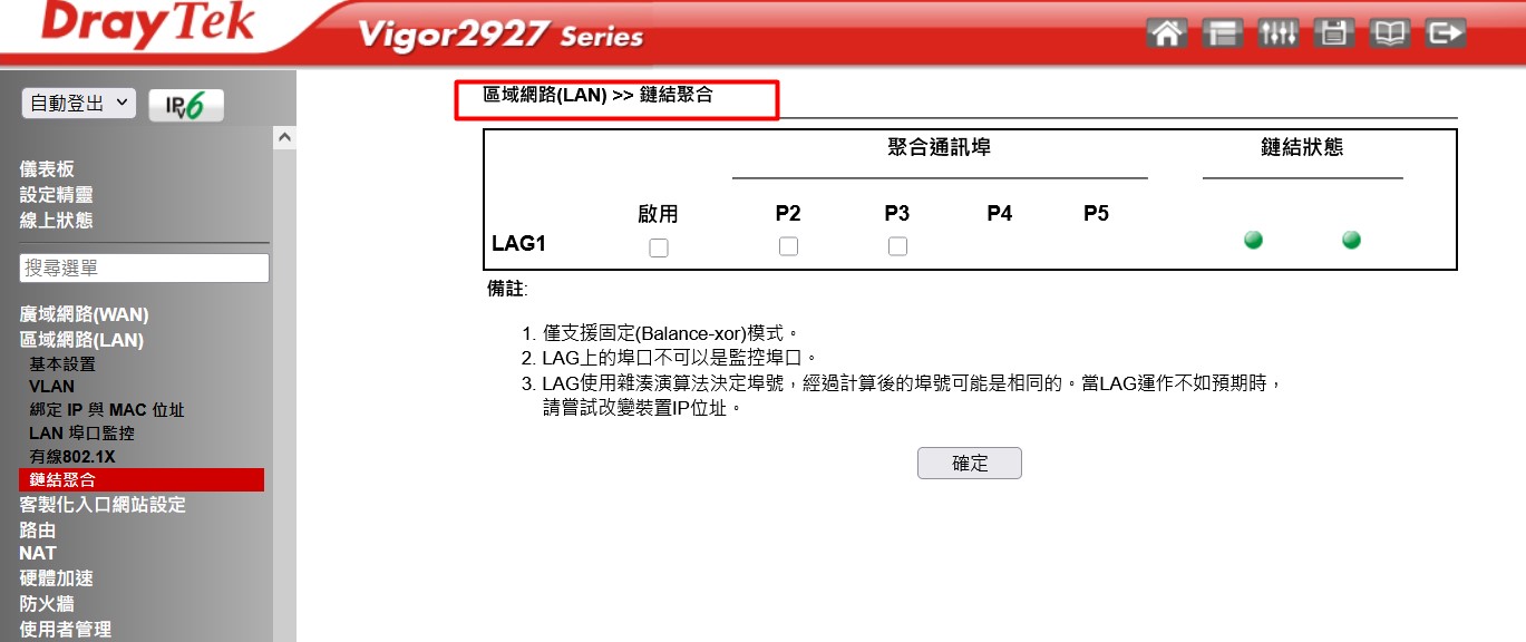 登入Vigor Router後點選[ 區域網路 > 鏈結聚合],將連接埠5&6的LAG群組選擇為1,LAG Group Mode則為平衡-xor,並點選兩次確定儲存後重開機。