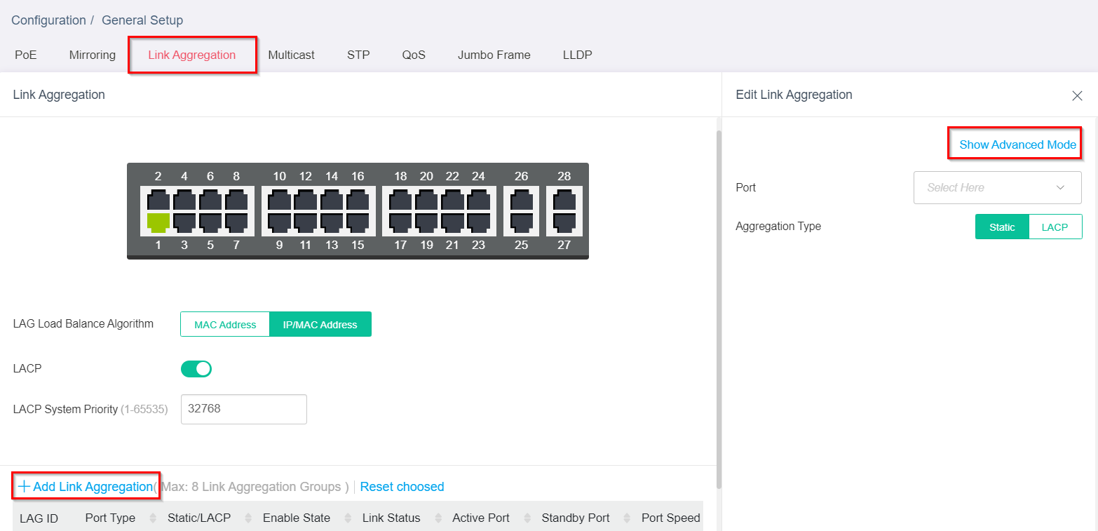 1. 點選[ Configuration > General Setup ],先將上方分頁切換為[ Link Aggreation ],點選下方[ Add Link Aggregation ] ,再點選右上方[ Show Advanced Mode ]。