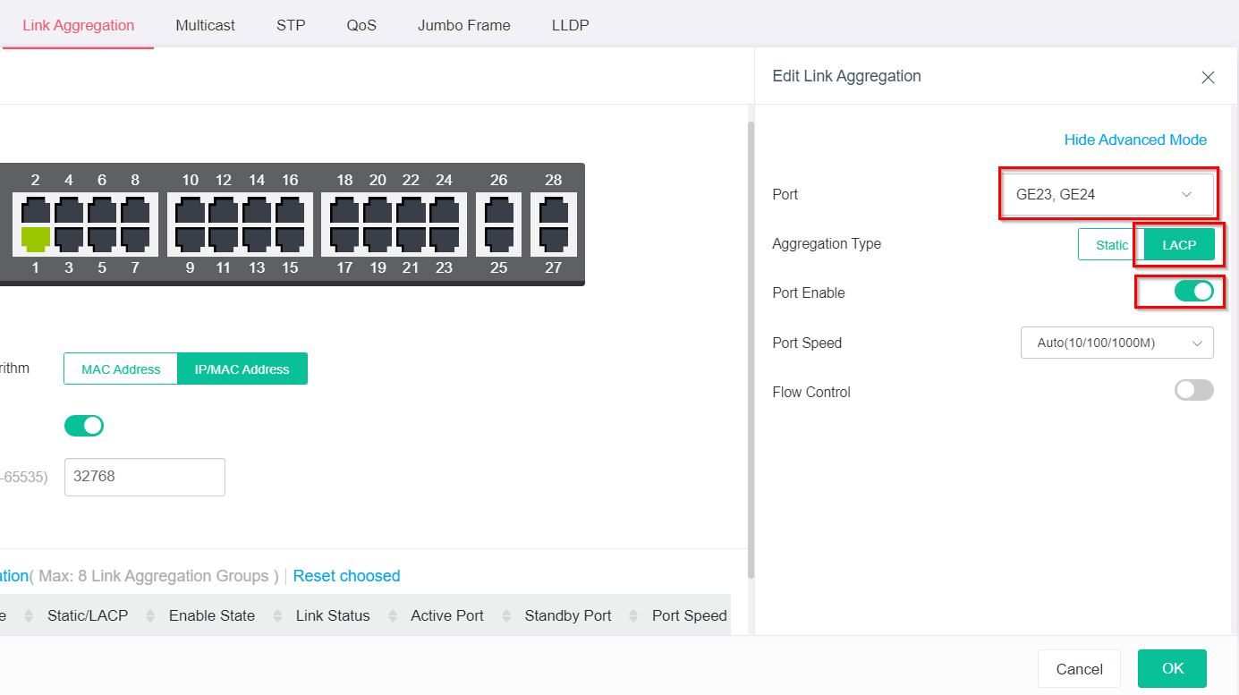 2. 點選Port下拉後勾選GE23&GE24,[Aggregation Type]調整為LACP,再將[Port Enable]調整為啟用,點選[OK]儲存設定。