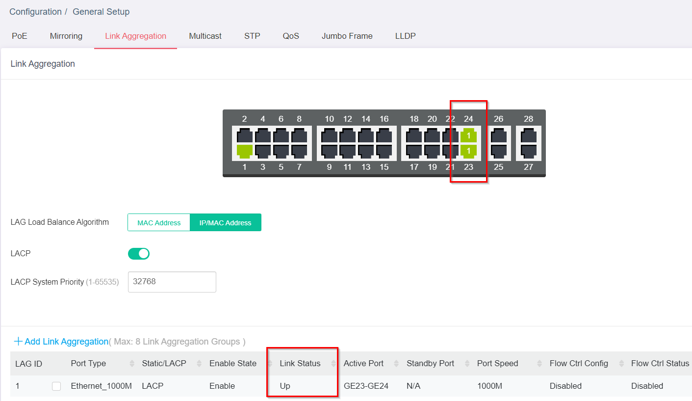 3. 設定完成後,若對端Switch或設備也已設定好相關LACP參數,可查看到[Link Status]連線狀態為UP,代表已和對方成功建立LACP連線。