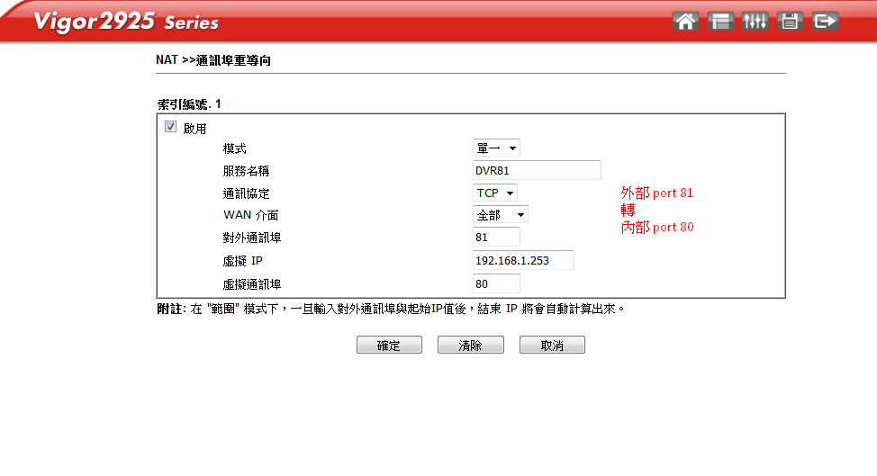 Vigor設定DVR-NVR開通訊埠重導向Port80