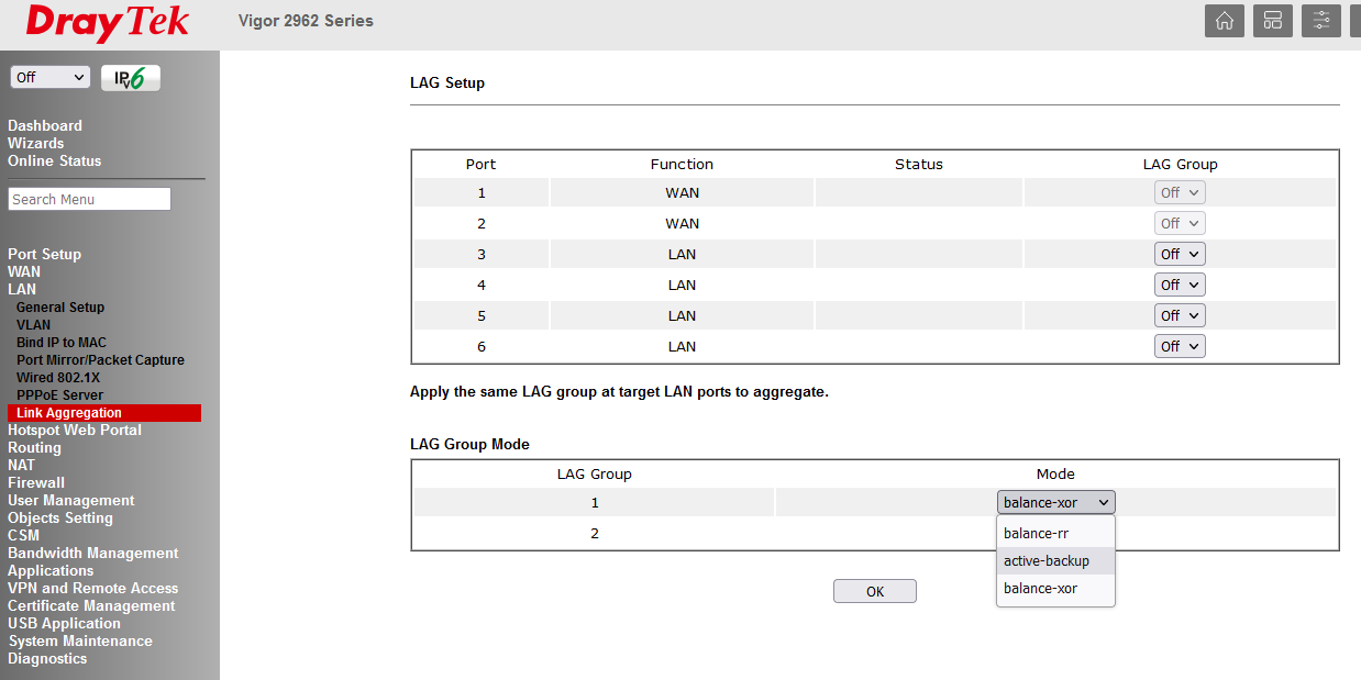 Vigor 2962 系列 Link Aggregation LAG Setup