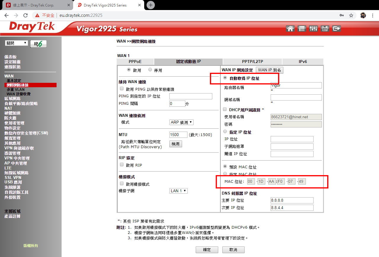 填寫到 Vigor Router Firewall 對接的 WAN Port 中