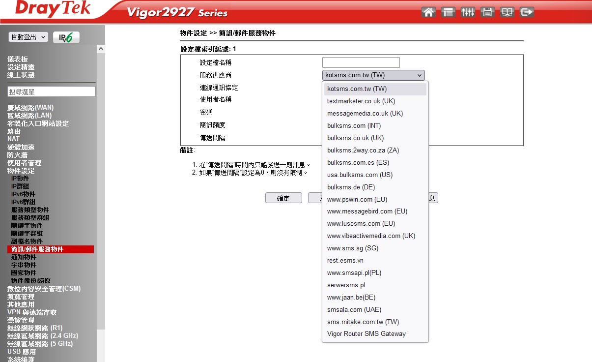 在 物件設定>> 簡訊/郵件服務物件中設定簡訊服務供應商