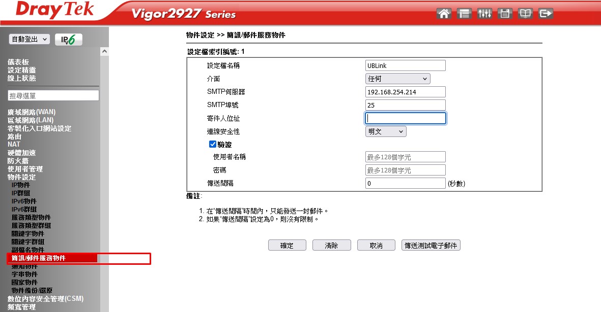 在 物件設定>> 簡訊/郵件服務物件中設定郵件伺服器