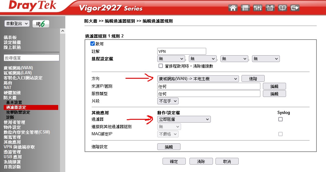 防火牆 >> 編輯過濾器組別 >> 編輯過濾器規則