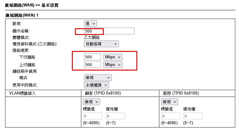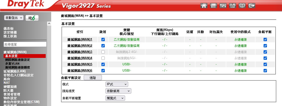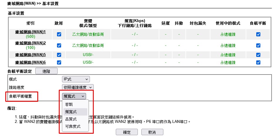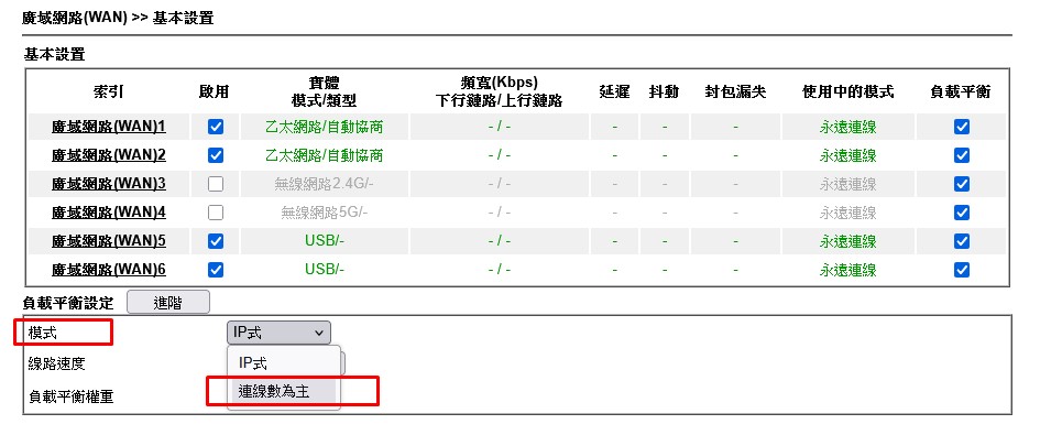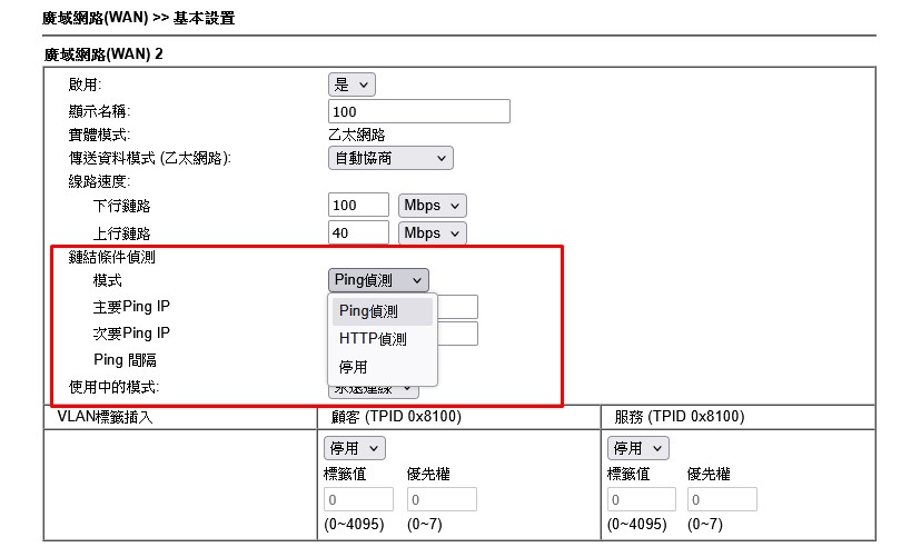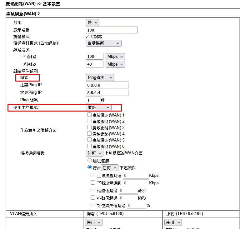 如果 WAN2 當成備援模式時的設定,可以選擇當WAN1斷線時才啟用
