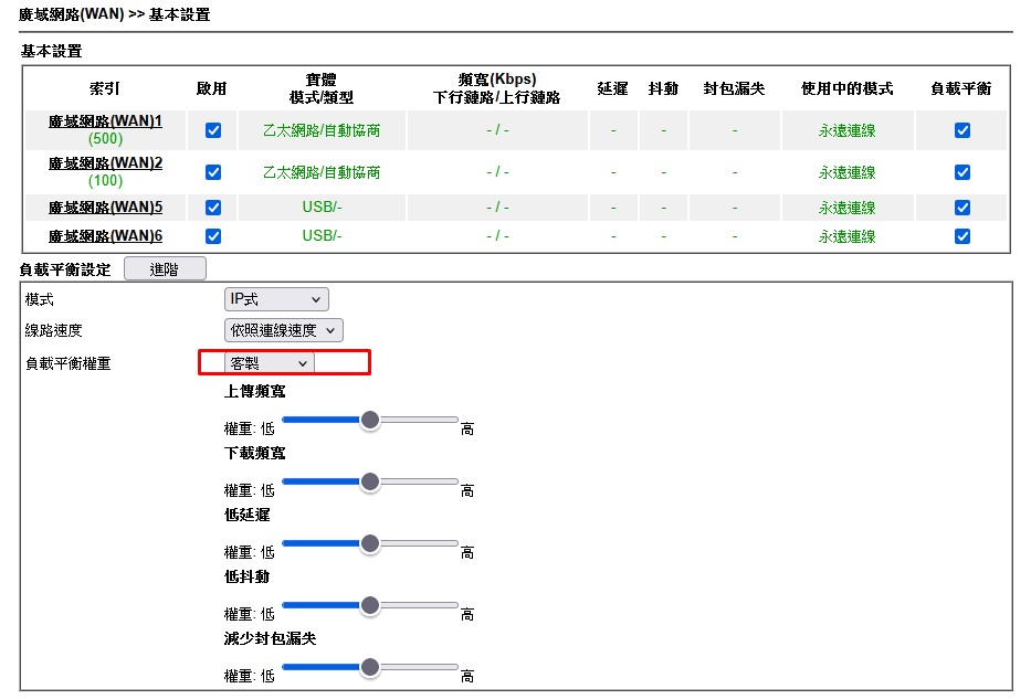 客製,預設中間值,自行調整這五項,上傳頻寬,下載頻寬,低延遲,低抖動,減少封包漏失