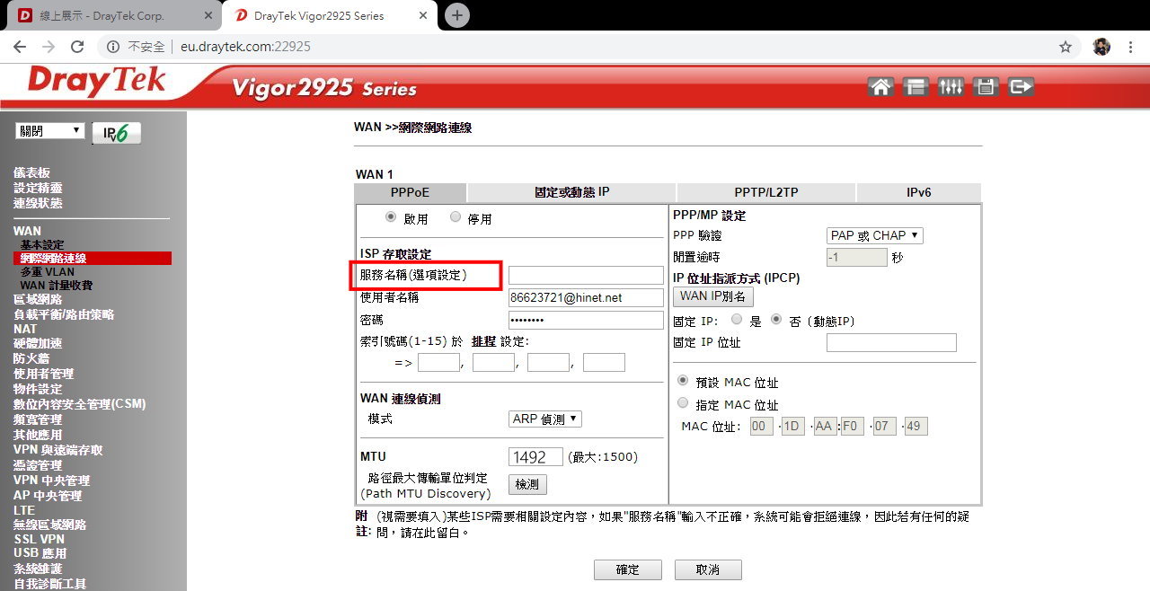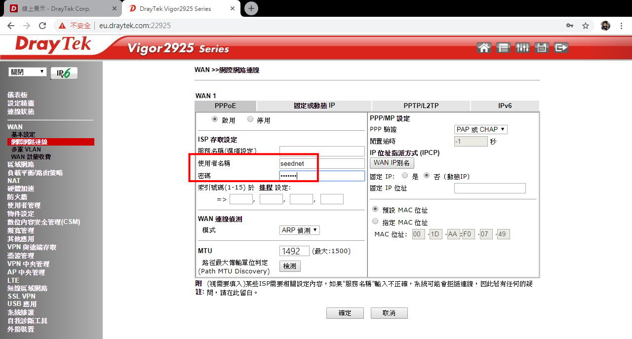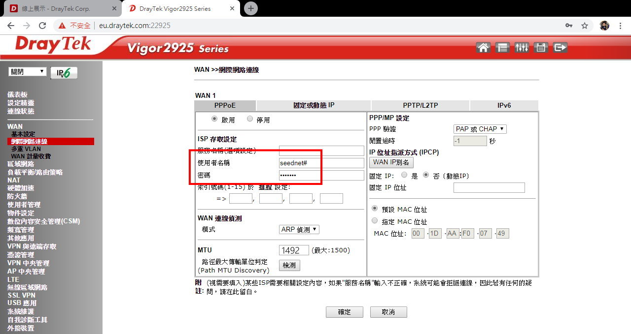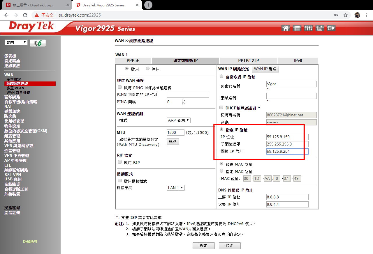 Vigor Wan 的各種設定 中華電信 pppoe seednet dhcp 取得ip 固定ip cable modem