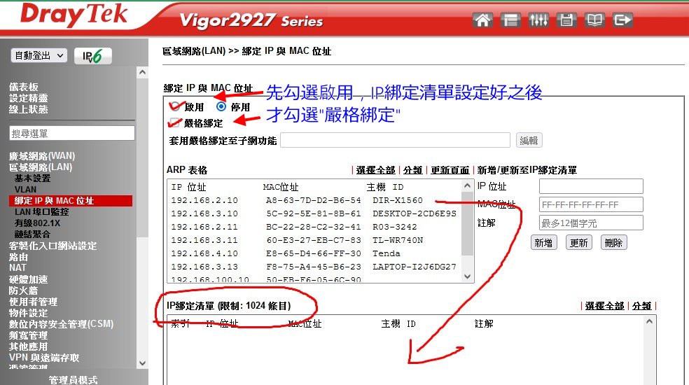 區域網路(LAN) >> 綁定 IP 與 MAC 位址