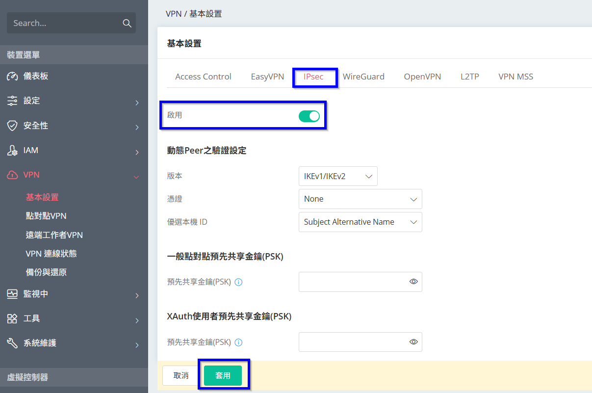 1. 登入Vigor路由器後點選[VPN > 基本設置 > IPSec],將狀態調整為啟用,再點選套用設定。