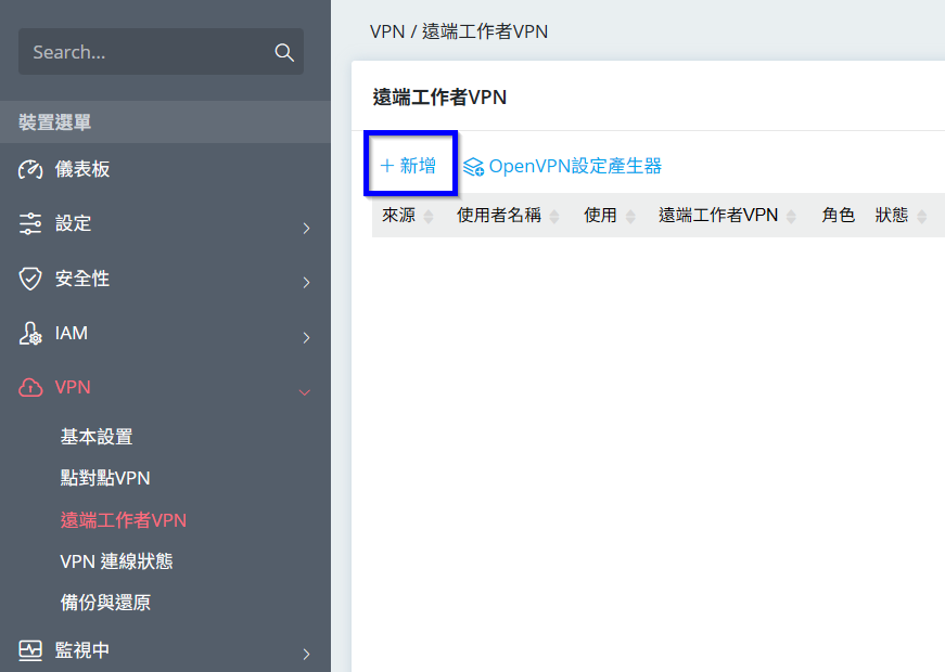 2. 點選[VPN > 遠端工作者VPN],點選新增帳號。