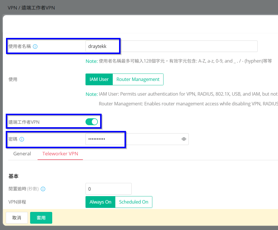 3. 依序輸入使用者名稱和密碼,並將遠端工作者VPN調整為啟用。