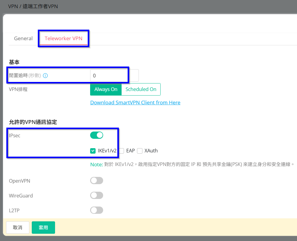 4. 切換帳號分頁至[Teleworker VPN],閒置逾時修改為0秒,允許的VPN通訊協定將IPSec啟用並勾選IKEv1/v2。