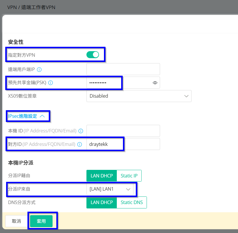 5. 安全性啟用指定對方VPN,填入預先共享金鑰(即連線的密碼),點選IPSec進階設定後,填入對方ID(即連線的帳號),此處可填入同使用者名稱的帳號。
