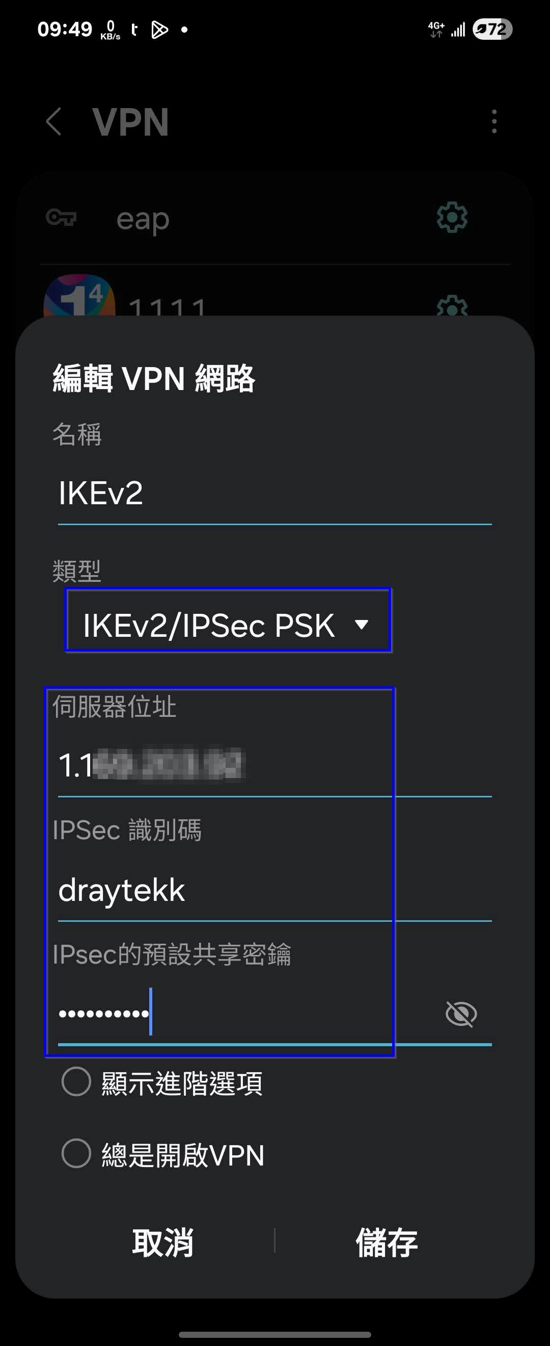 1. 手機於網路設定VPN相關頁面,點選新增VPN後,類型修改為IKEv2/IPSec PSK,伺服器位址填入路由器WAN IP,IPSec識別碼填入ID名稱,IPSec預設共享密鑰填入同路由器的金鑰,再點選儲存設定。