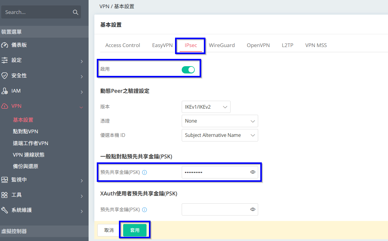 1. 登入Vigor路由器後點選[VPN > 基本設置 > IPSec],將狀態調整為啟用,預先共享金鑰填入要給使用者連入的IPSec金鑰密碼,再點選套用設定。