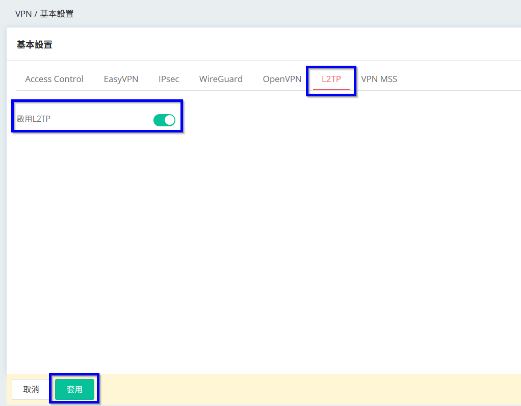 2. 上方分頁切換至[L2TP],將L2TP狀態調整為啟用,再點選套用設定。