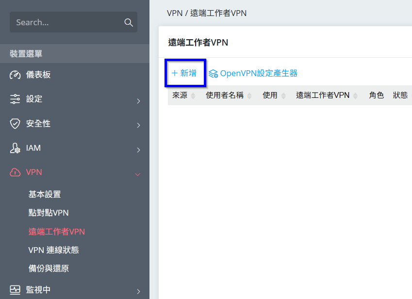 3. 點選[VPN > 遠端工作者VPN],點選新增帳號。