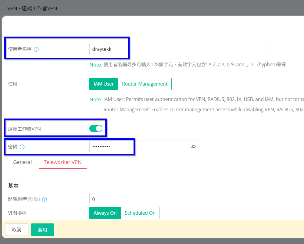 4. 依序輸入使用者名稱和密碼,並將遠端工作者VPN調整為啟用。