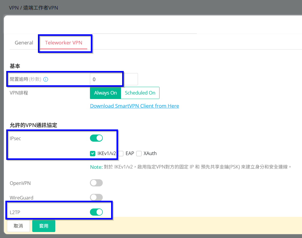 5. 切換帳號分頁至[Teleworker VPN],閒置逾時修改為0秒,允許的VPN通訊協定將IPSec啟用並勾選IKEv1/v2,並同時啟用L2TP。