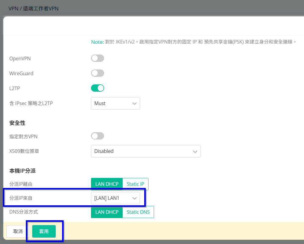 6. 本機IP分派為VPN撥入後允許存取區網段,這邊選擇預設的LAN1,再點選套用設定。