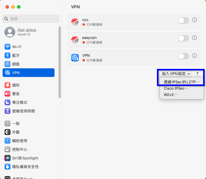 1. 開啟macOS的[系統設定 > VPN],點選加入VPN設定,類型選擇為透過IPSec的L2TP。