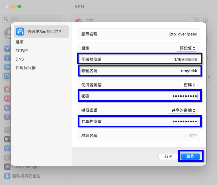 2. 依序填入伺服器位址為路由器WAN IP或網域名稱,填入帳號名稱和密碼,共享的密碼填入路由器步驟1的IPSec金鑰密碼,再點選製作。