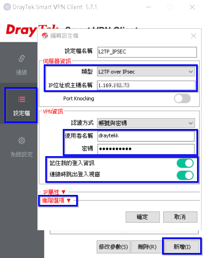 2. 執行SmartVPN Client後,點選設定檔新增設定,依序輸入設定檔名稱,VPN類型選擇為L2TP over IPSec,IP位址填入路由器WAN IP或網域名稱,填入使用者名稱和密碼,並將記住我的登入資訊調整為啟用,再點選進階選項。