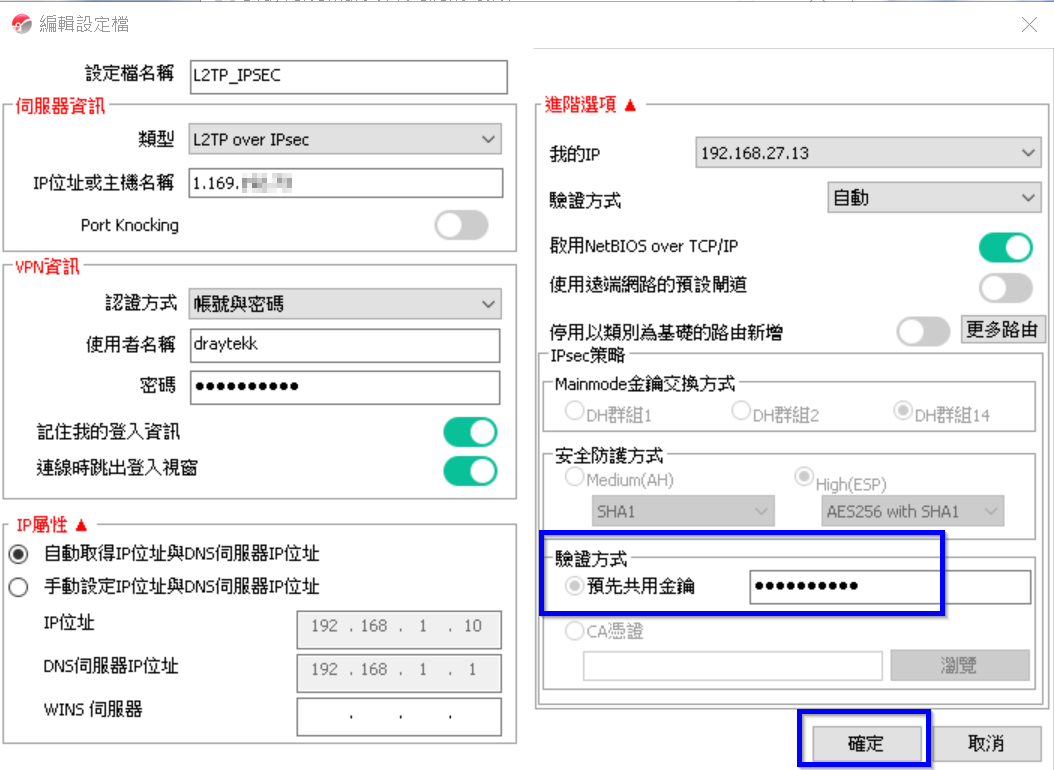 3. 預先共用金鑰填入路由器步驟1的IPSec金鑰密碼,點選確定新增設定檔。