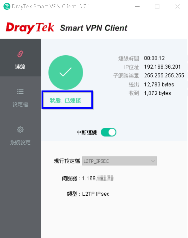 4. 可查看到VPN狀態顯示為已連線。