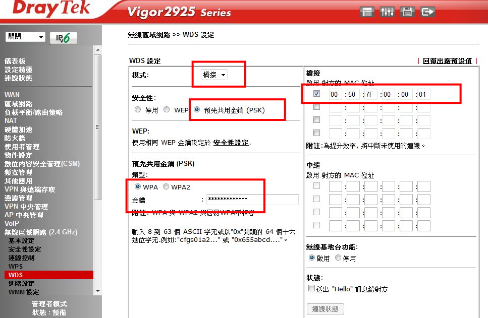 Vigor2925n+設定Wifi 無線 WDS 模式