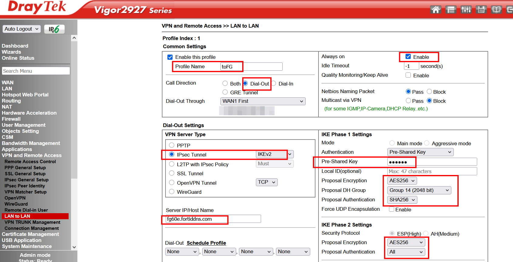 Vigor2927 當 VPN LAN to LAN 撥出端