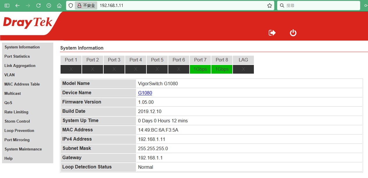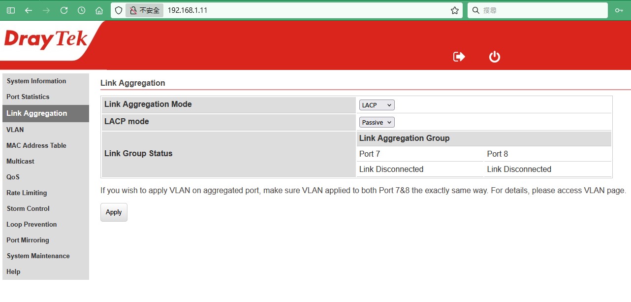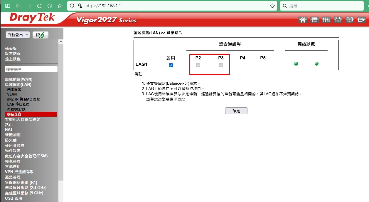 Vigor2927 VigorSwitch G1080 LACP 區域網路(LAN) >> 鏈結聚合 設定