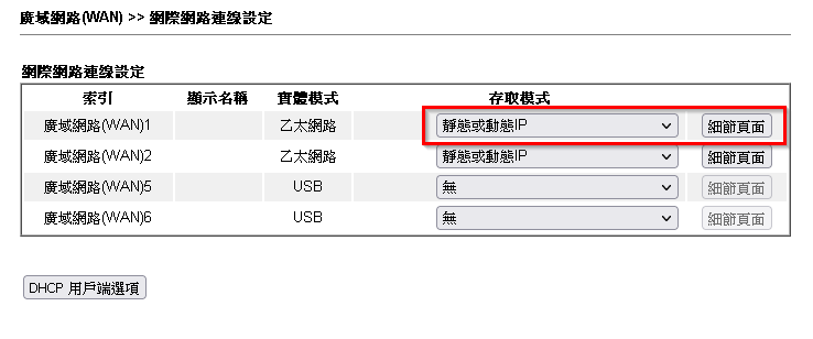 1.登入路由器後點選[ 廣域網路 > 網際網路連線 ],WAN1存取模式選擇為靜態或動態IP,再點選細節頁面。