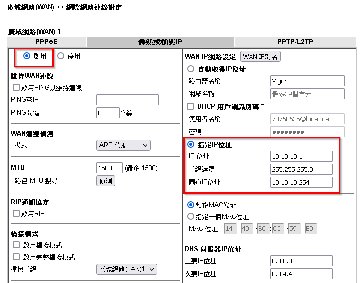 2.介面設定為啟用,WAN IP 網路設定為指定IP位址,並依序輸入IP資訊。