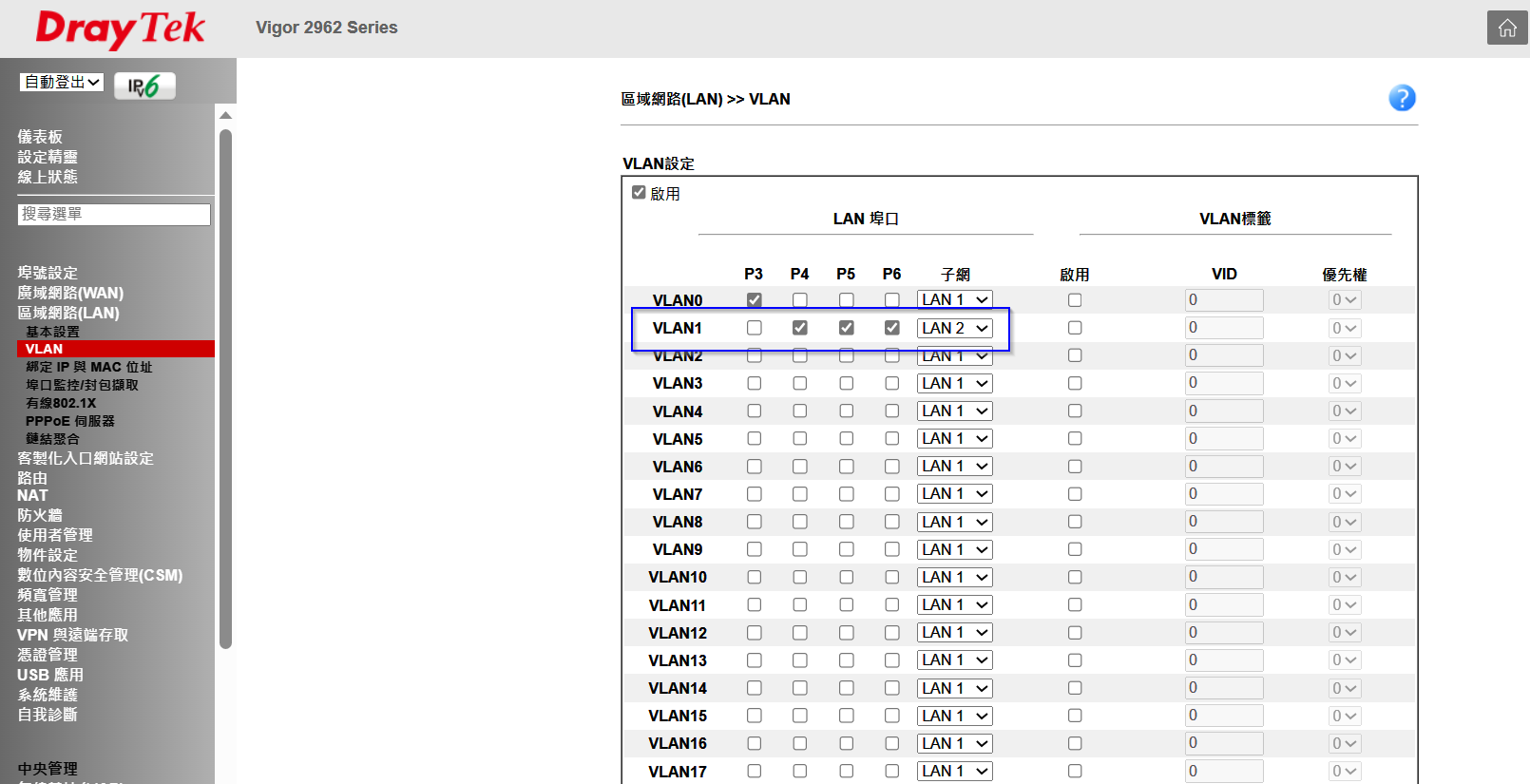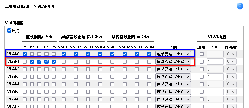 3.點選[ 區域網路 > VLAN ],VLAN0勾選P1(若為無線機型也將所有SSID介面勾選),VLAN1勾選P2~P5,並將子網選擇為區域網路LAN2。