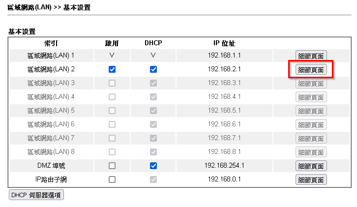 4.點選[ 區域網路 > 基本設定 ],LAN2點選細節頁面。