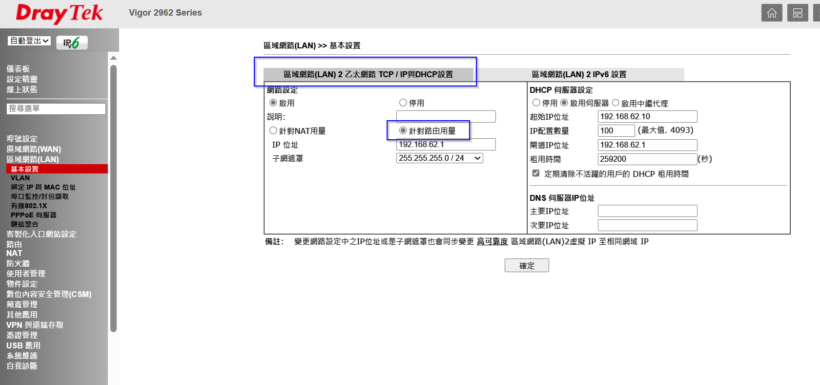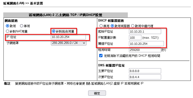 5.將模式選擇為針對路由用量,並輸入所要變更的路由網段IP和DHCP配發參數。