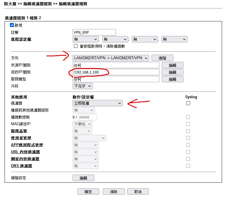 VigorRoute Firewall Filter LAN to LAN Site to Site VPN 限制只能到達ERP或是Mail Server指定的IP