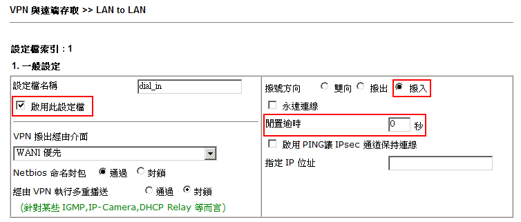 1. 登入 Vigor2925A,此台設定為 VPN 撥入方,點選 "VPN 與遠端存取 > LAN to LAN > 索引編號1 ",輸入設定檔名稱後,勾選啟用設定檔,撥號方向選擇為撥入,閒置逾時修改為0秒。