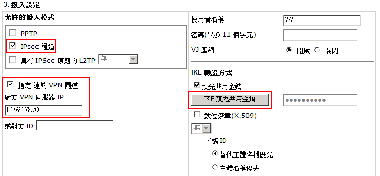 2. 在撥入設定 > 允許撥入模式,勾選 IPSec 通道 & 指定遠端 VPN 閘道,並輸入 Vigor2925B 的 WAN IP位址,點選 IKE 預先共用金鑰後輸入 VPN 密碼